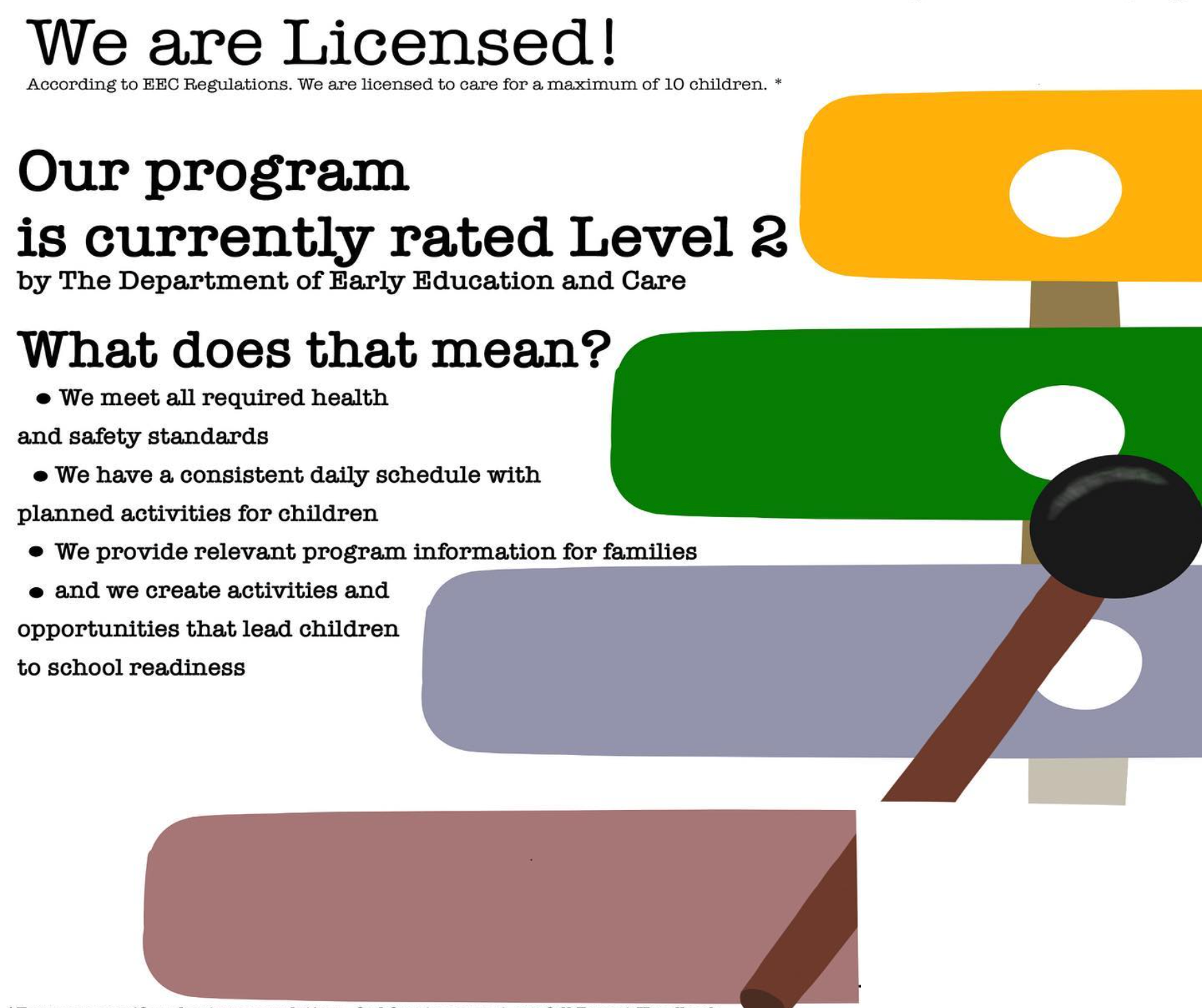 An informational poster about a childcare program's licensing and ratings, featuring colorful graphics of a tree and a paintbrush with bullet points explaining what the rating means.
